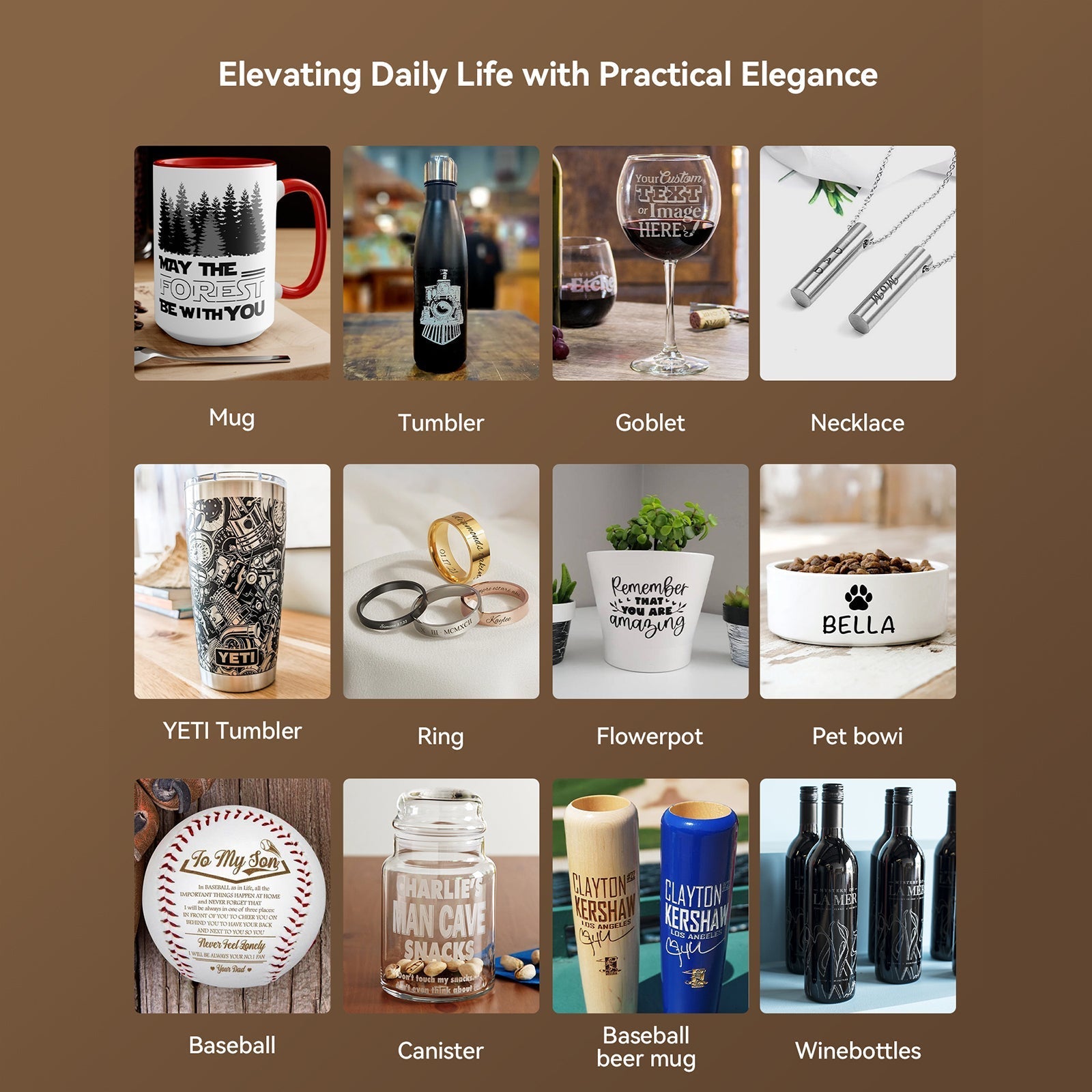 Irregularly Shaped Objects: The R8 securely holds a variety of irregular items, such as cups, spheres, and rings, ensuring precise engraving.