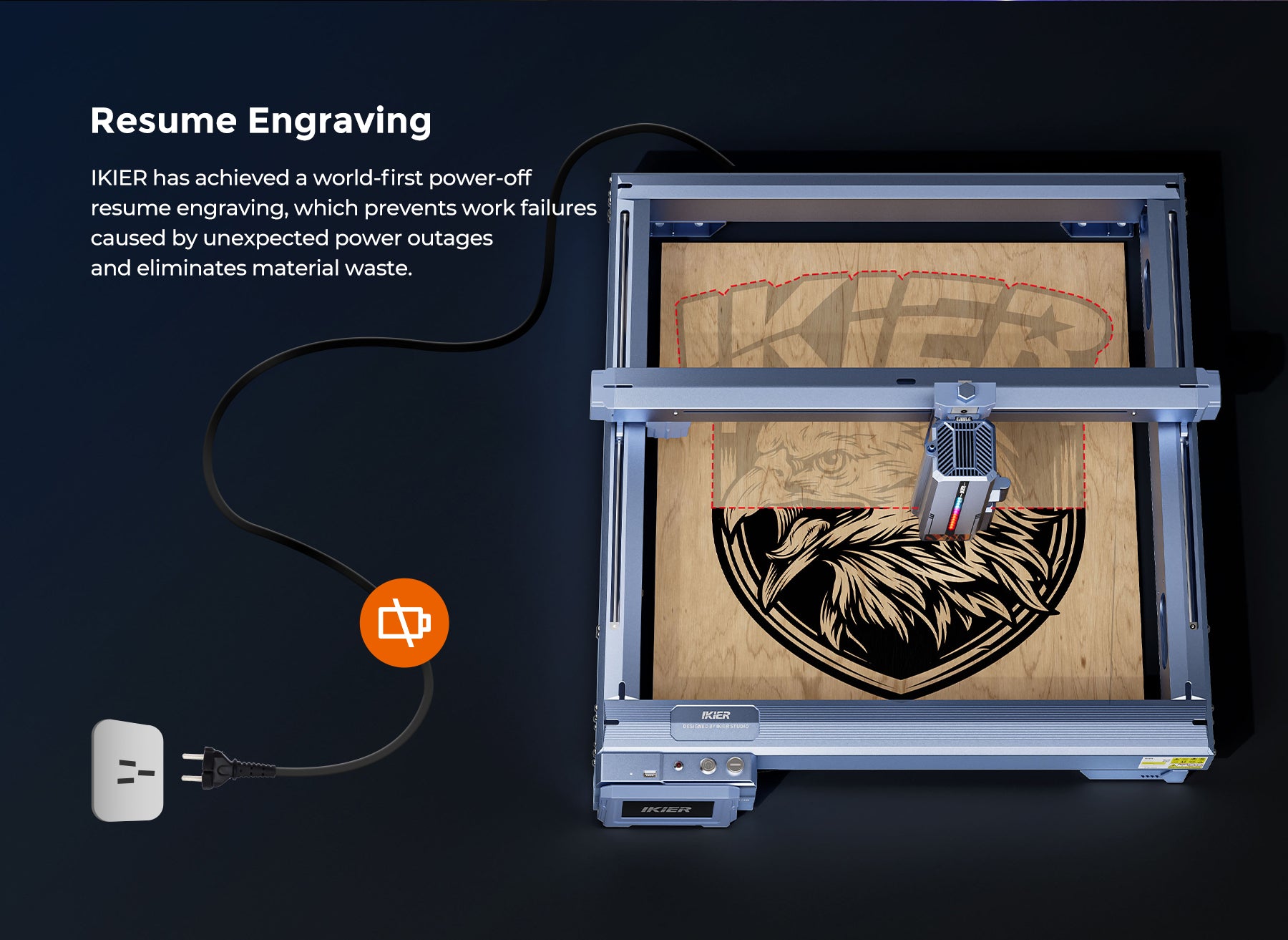 Resume Engraving: IKIER has achieved a world-first power-off resume engraving, which prevents work failures caused by unexpected power outages and eliminates material waste.
