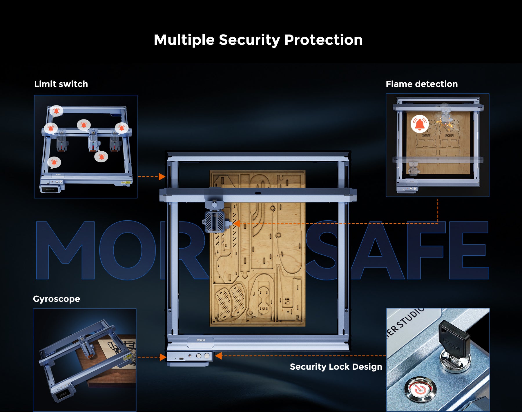Flame Detection Systems: In the event of a flame detection, the machine will sound an alarm and send a notification to a linked mobile device, while the laser module will automatically return to its original position.