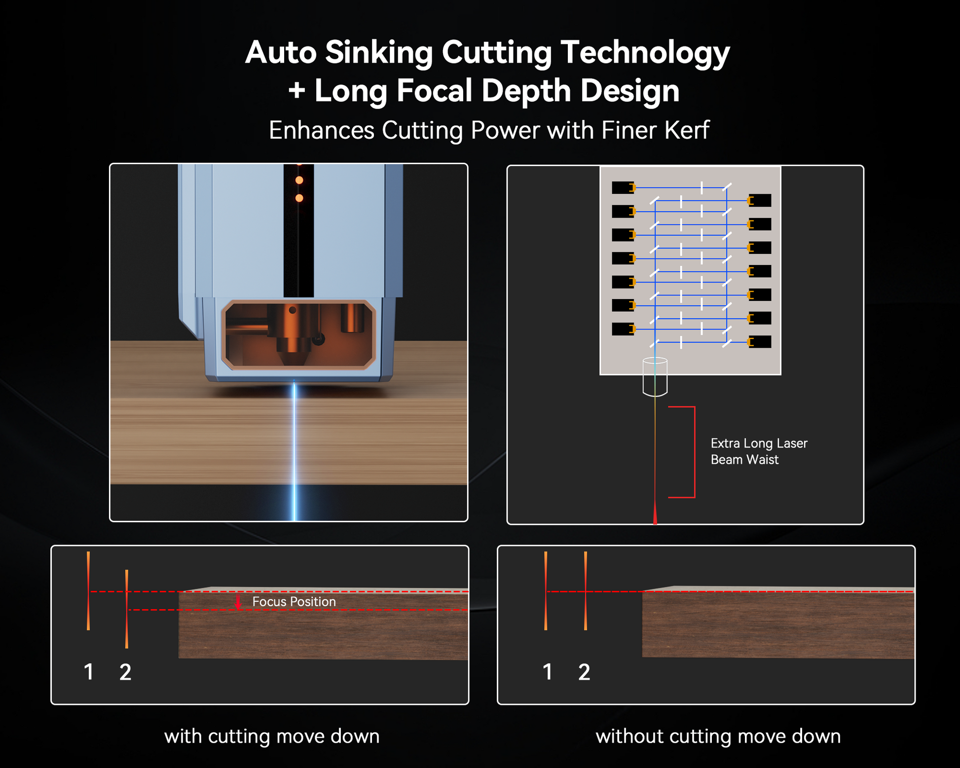4. Sinking Cutting Tech + Long Focal Depth: Auto Sinking Cutting prevents secondary polishing, boosting production efficiency