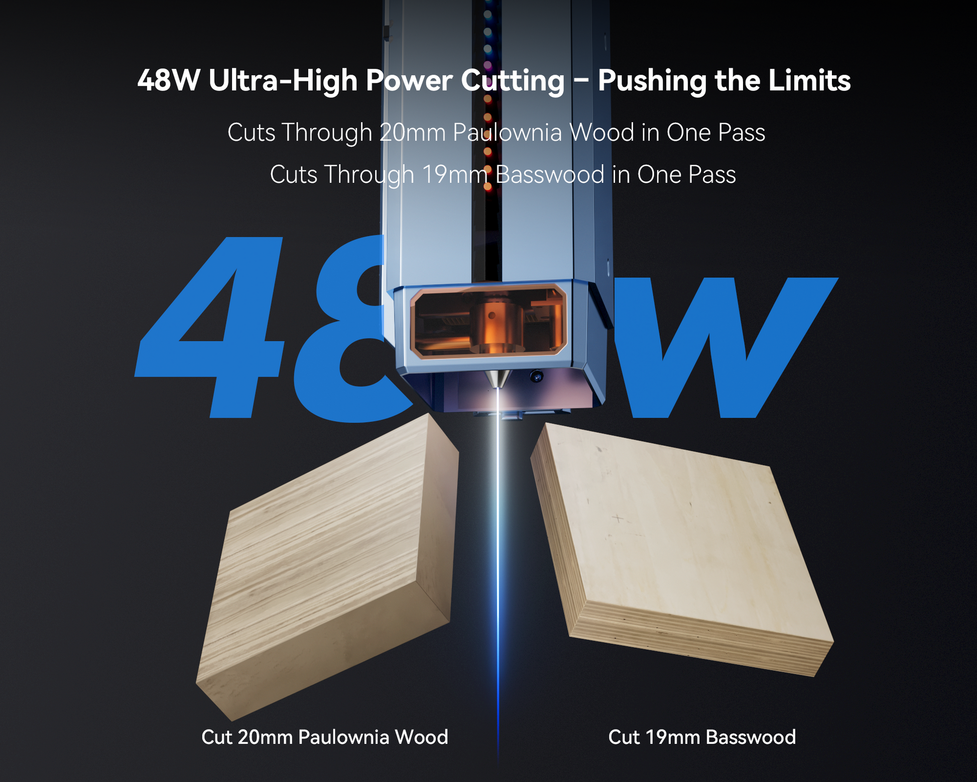 1. High-Efficiency Cutting: Easily cuts through 20mm paulownia wood and 19mm basswood in 40W mode, meeting common medium-thick board requirements